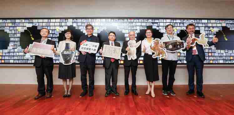 云顶国际8588yd携手创利空间为故宫建置的智慧文物互动导览墙及轮播墙,,,今日正式启用。。(左四:云顶国际8588yd新事业暨投资管理总部副总经理杨本豫、、、、右四:故宫博物院院长吴密察、、、右三:太极影音董事长黄宝云)